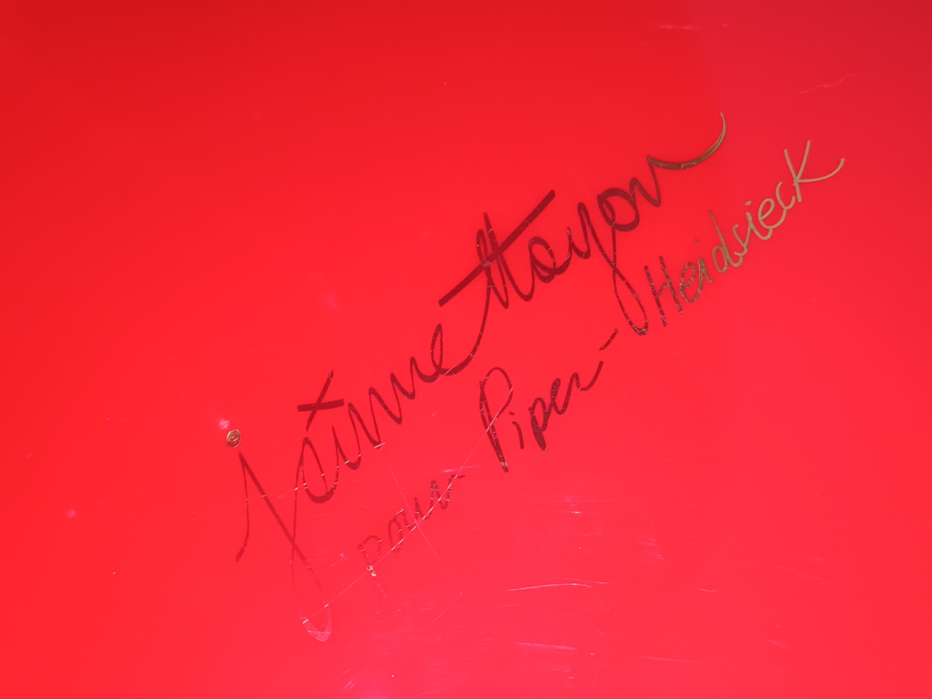 Op de basis staat in goudkleur de handtekening gedrukt.
