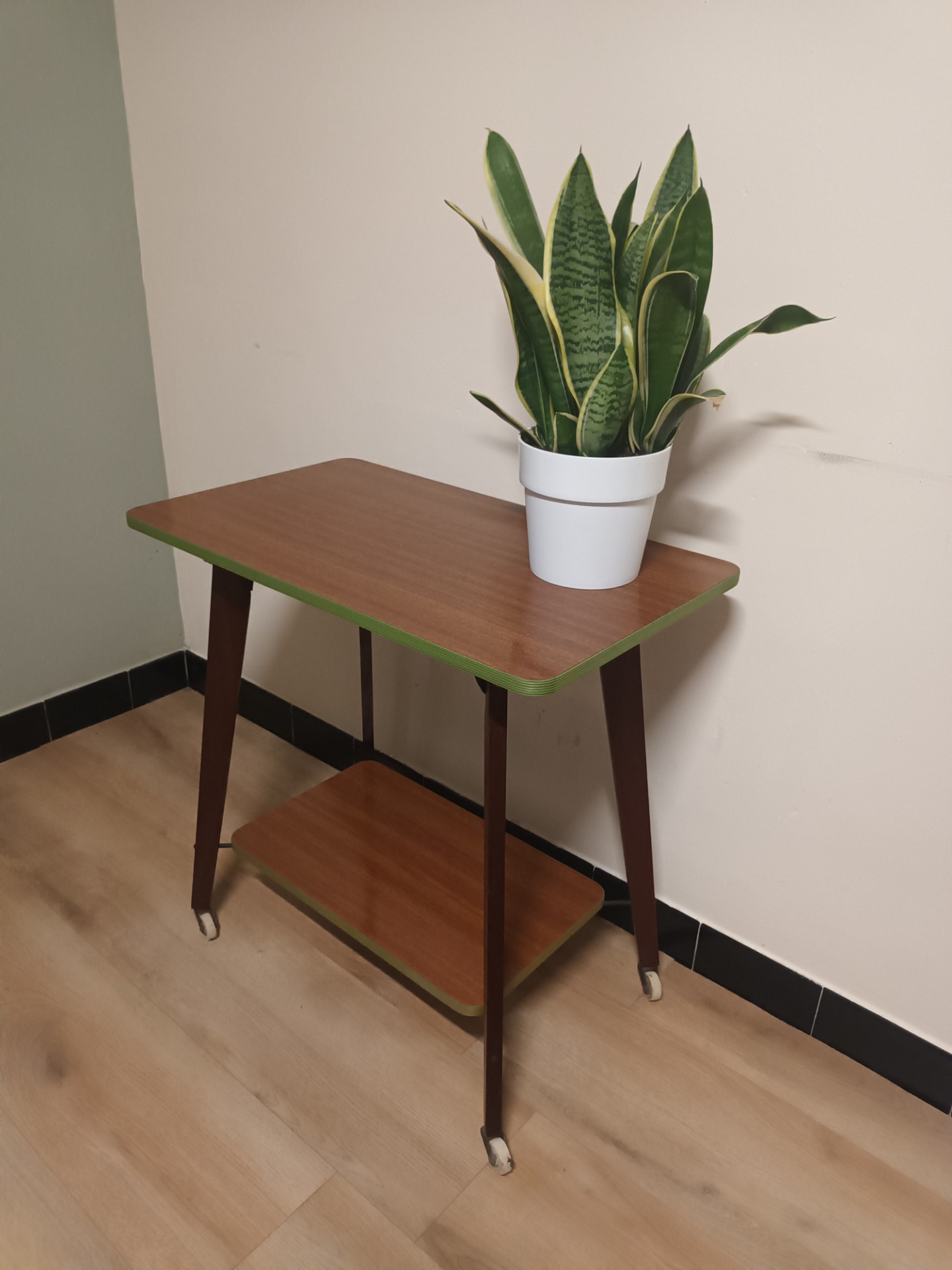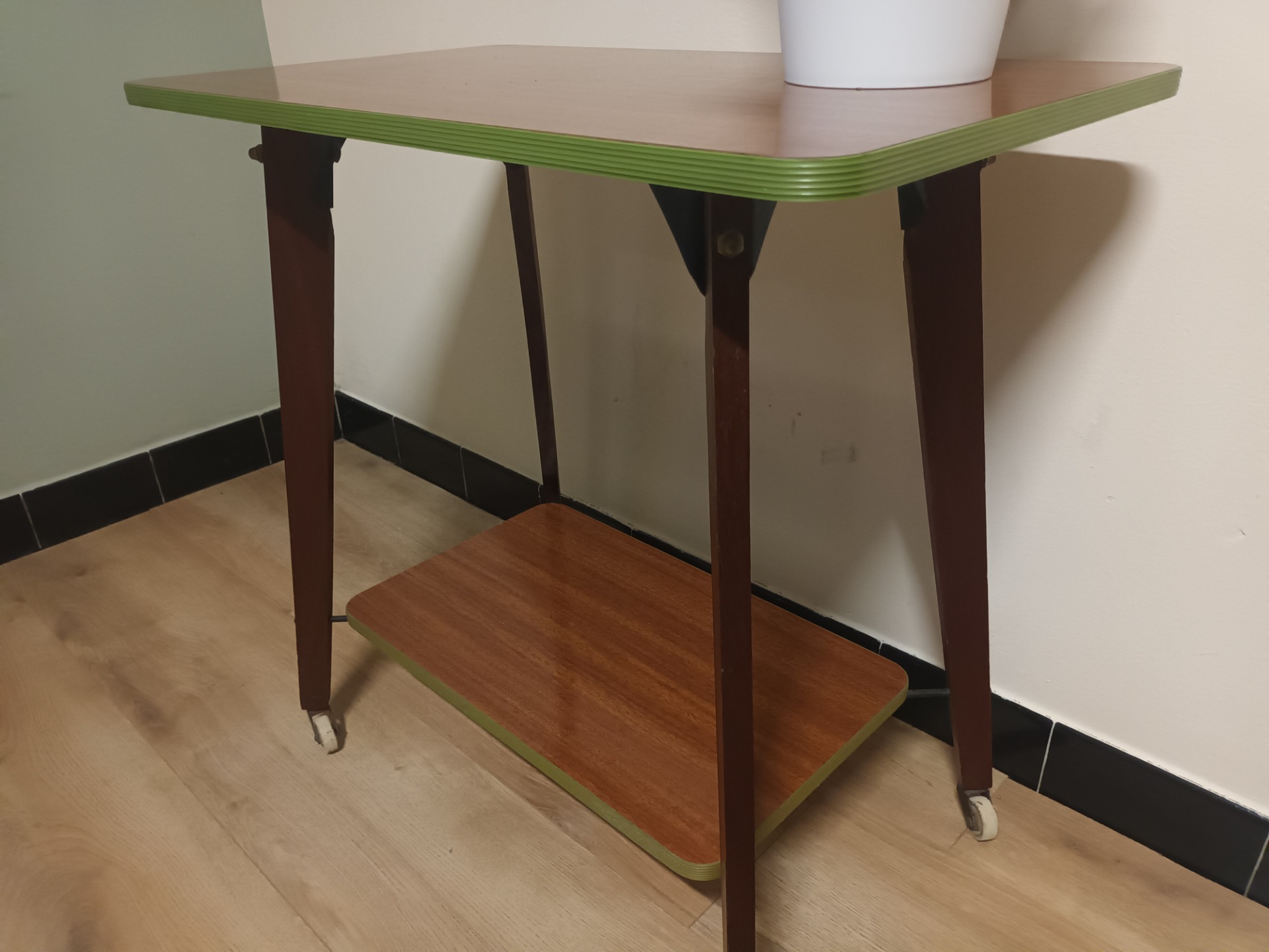 Retro bijzettafel met wielen. Deze tafel uit de jaren 60 heeft een bovenblad en een onderblad in formica. Beide niveaus zijn in zeer goede staat en hebben een lichtgroene boord. De wielen rijden nog maar zijn een beetje versleten.