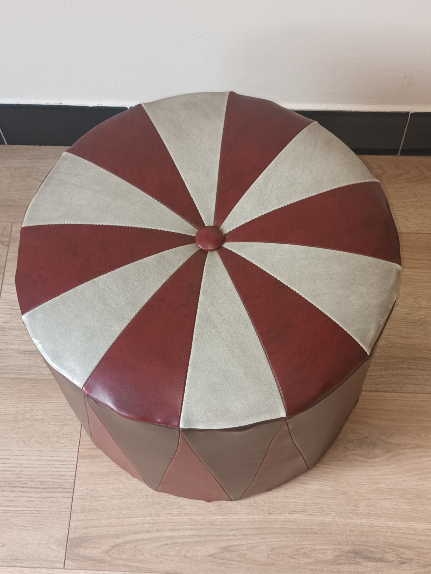 Ervaar de charme van vervlogen tijden met deze prachtige vintage poef. Dit unieke stuk, met zijn opvallende rood, bruin en crème kleurenschema, voegt een vleugje nostalgie toe aan elke huiskamer. Ideaal voor gebruik als extra zitplaats of als decoratief element.