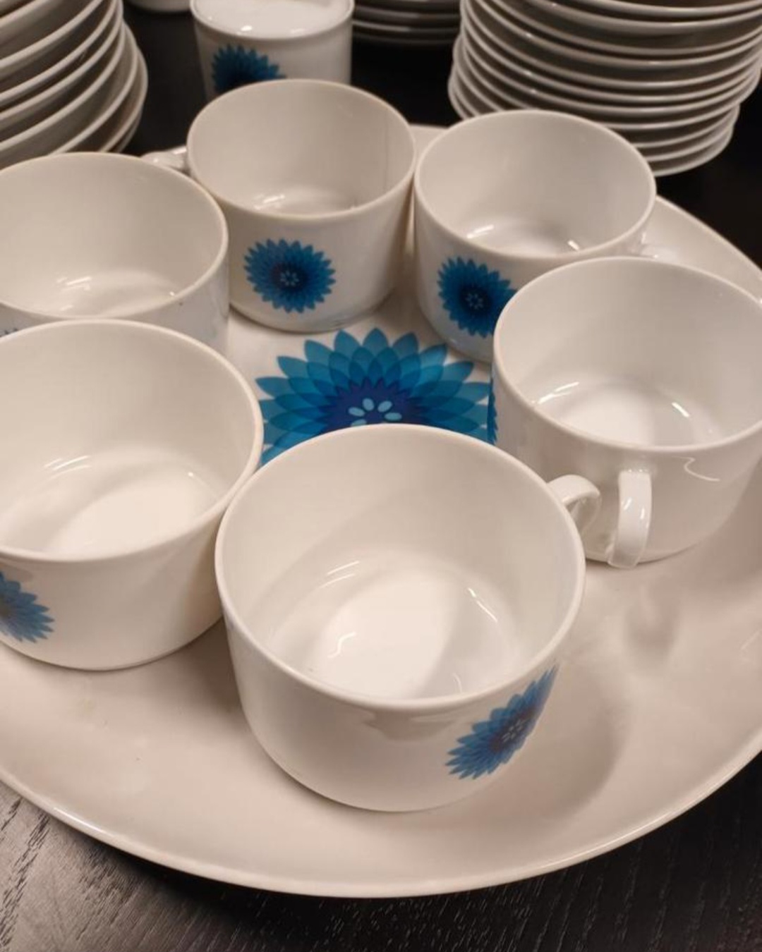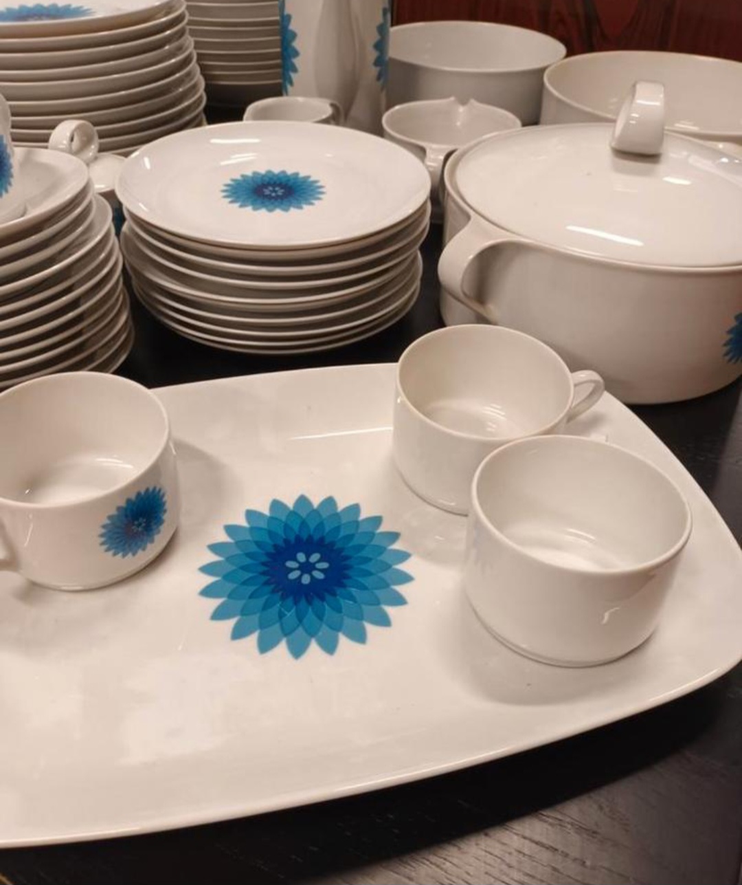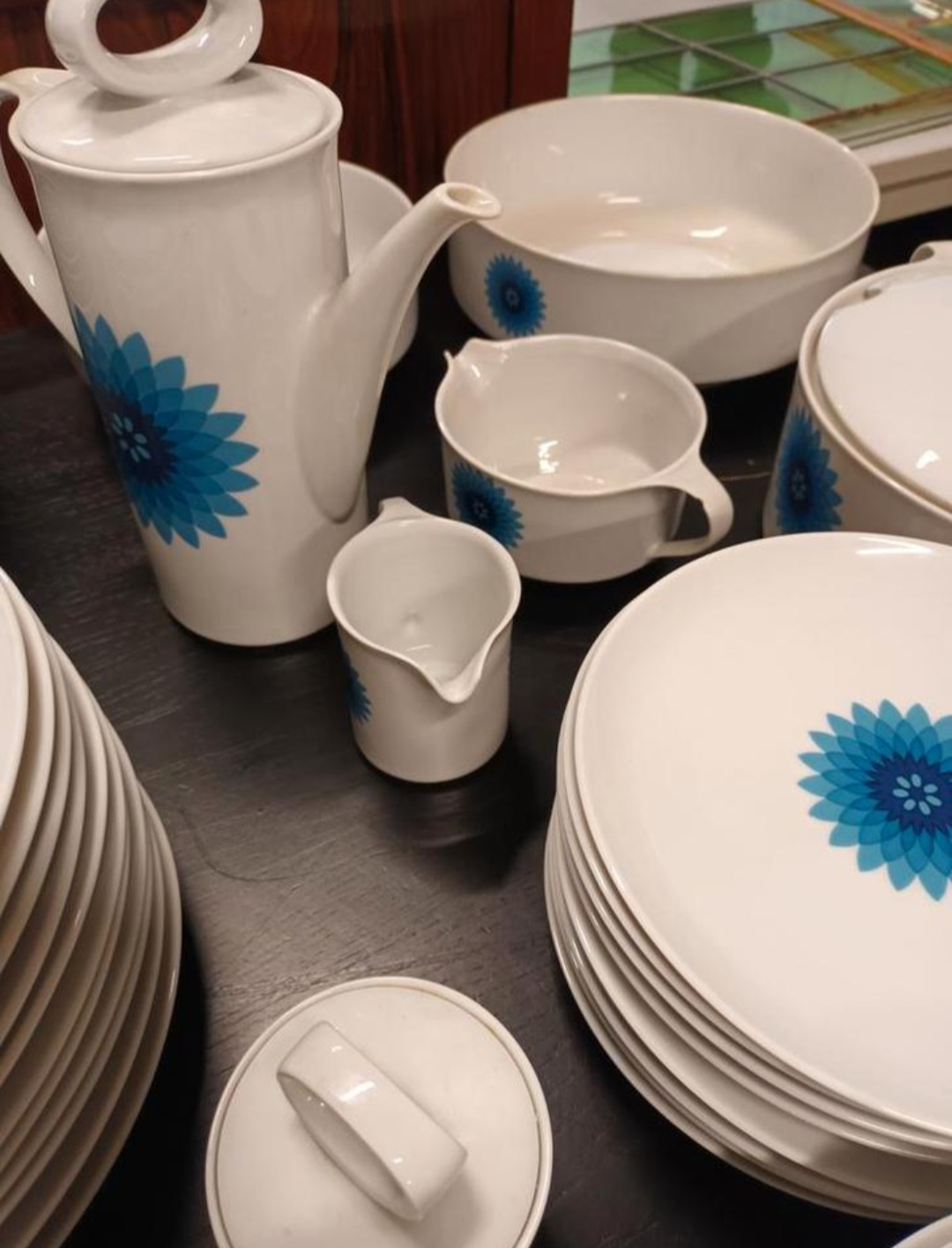 Dit populaire mid-century retro ontwerp uit de jaren 60 en 70 kenmerkt zich door het grafische, gestileerde bloemenpatroon. Het servies is vervaardigd in Duitsland (Bavaria) en is geliefd onder verzamelaars van vintage design.