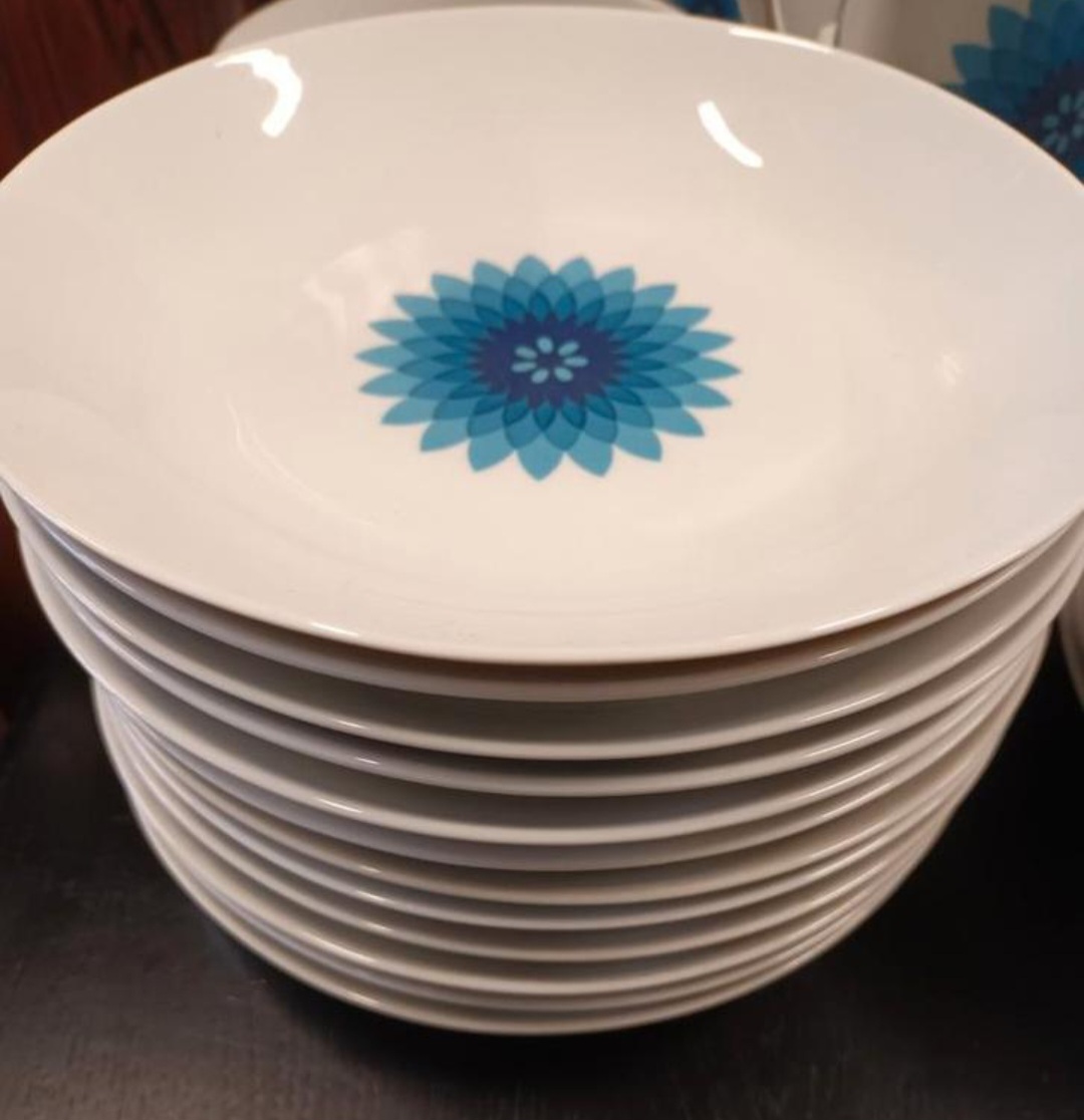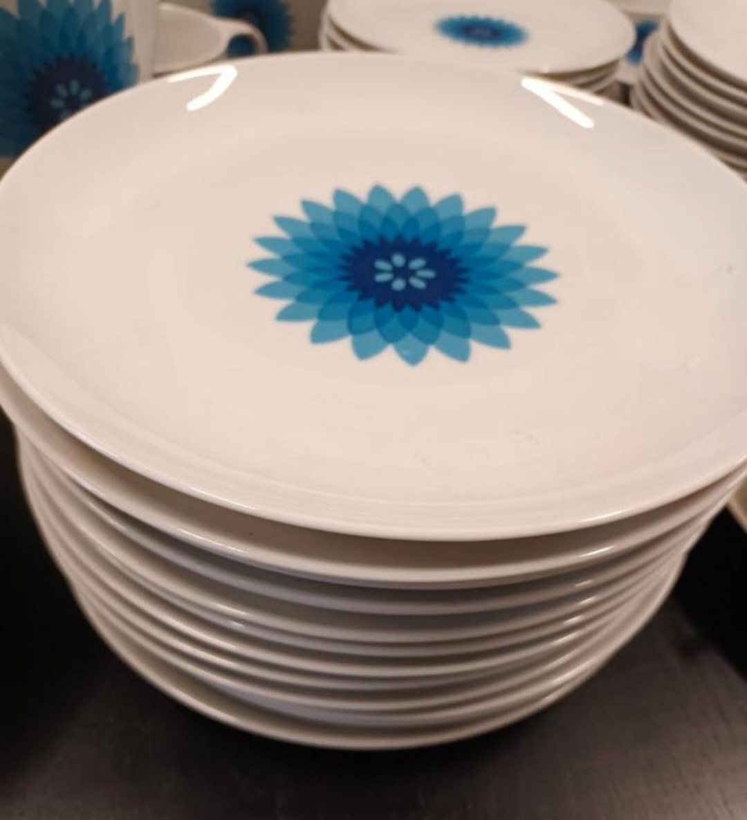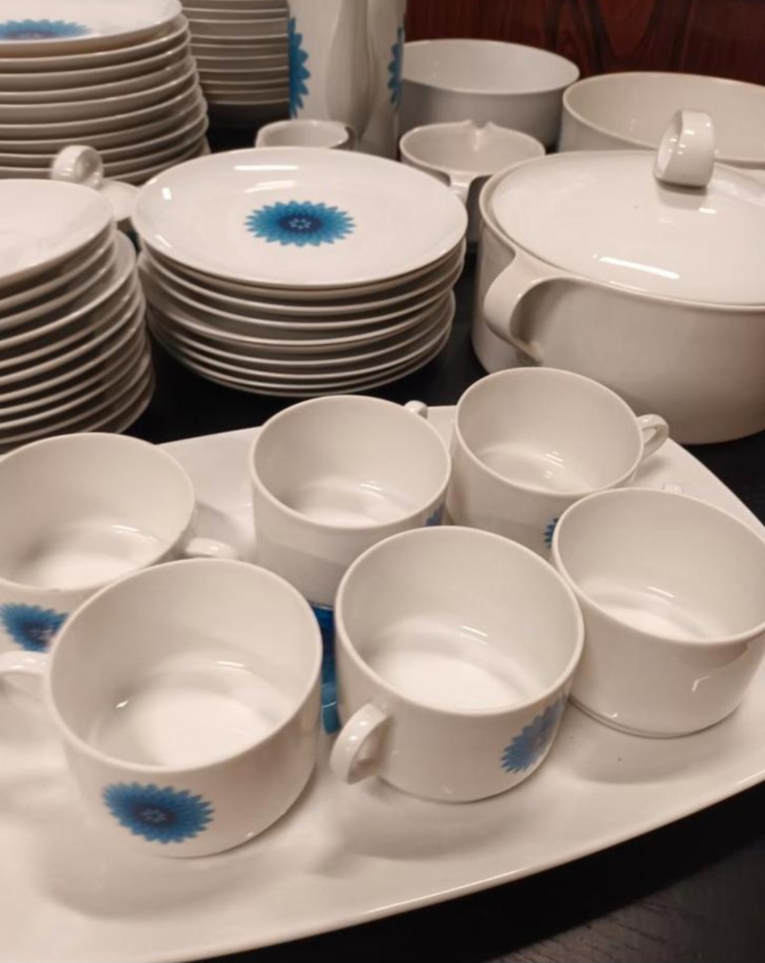 Dit populaire mid-century retro ontwerp uit de jaren 60 en 70 kenmerkt zich door het grafische, gestileerde bloemenpatroon. Het servies is vervaardigd in Duitsland (Bavaria) en is geliefd onder verzamelaars van vintage design.