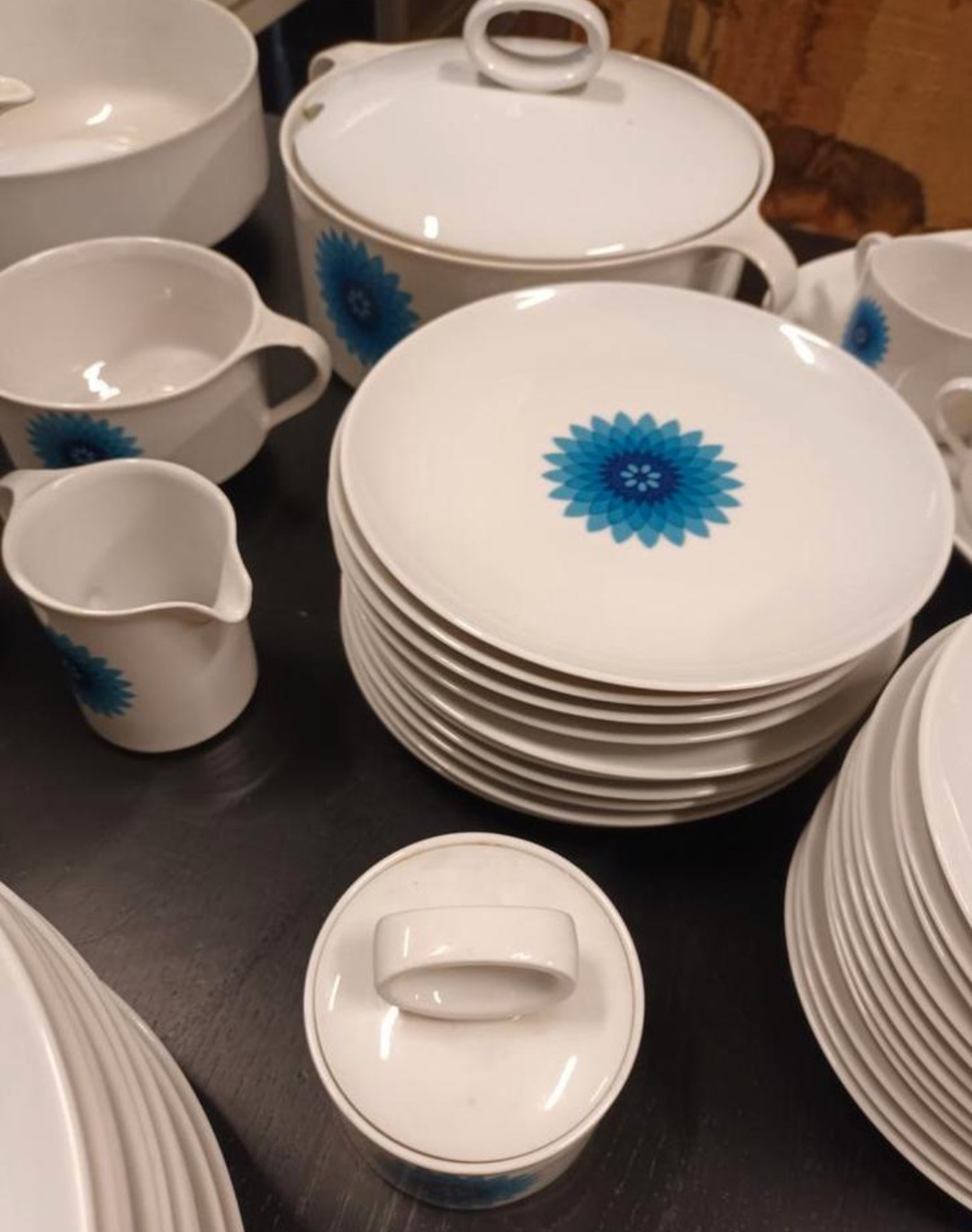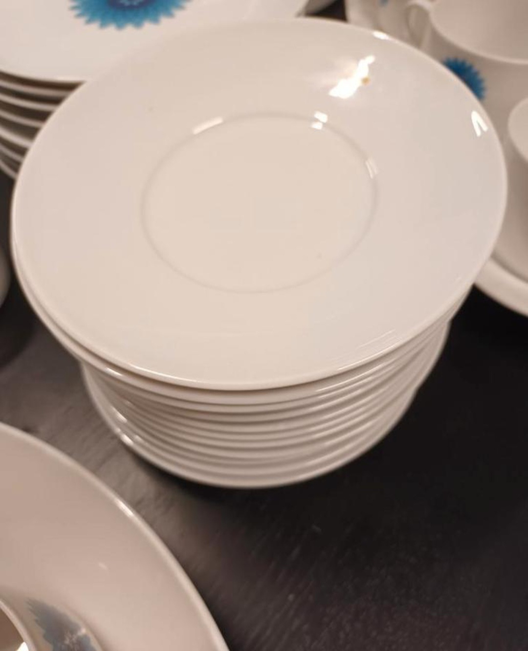 Dit servies is het Eschenbach Bavaria porselein, met het iconische "Prilblume" (of "Prillblume") decor in het blauw.