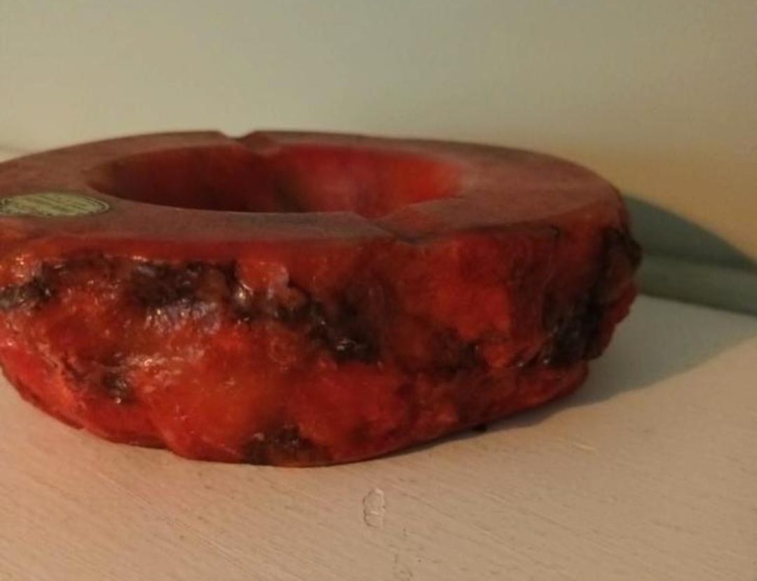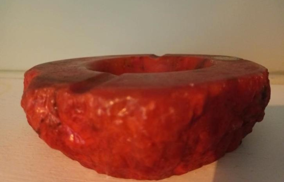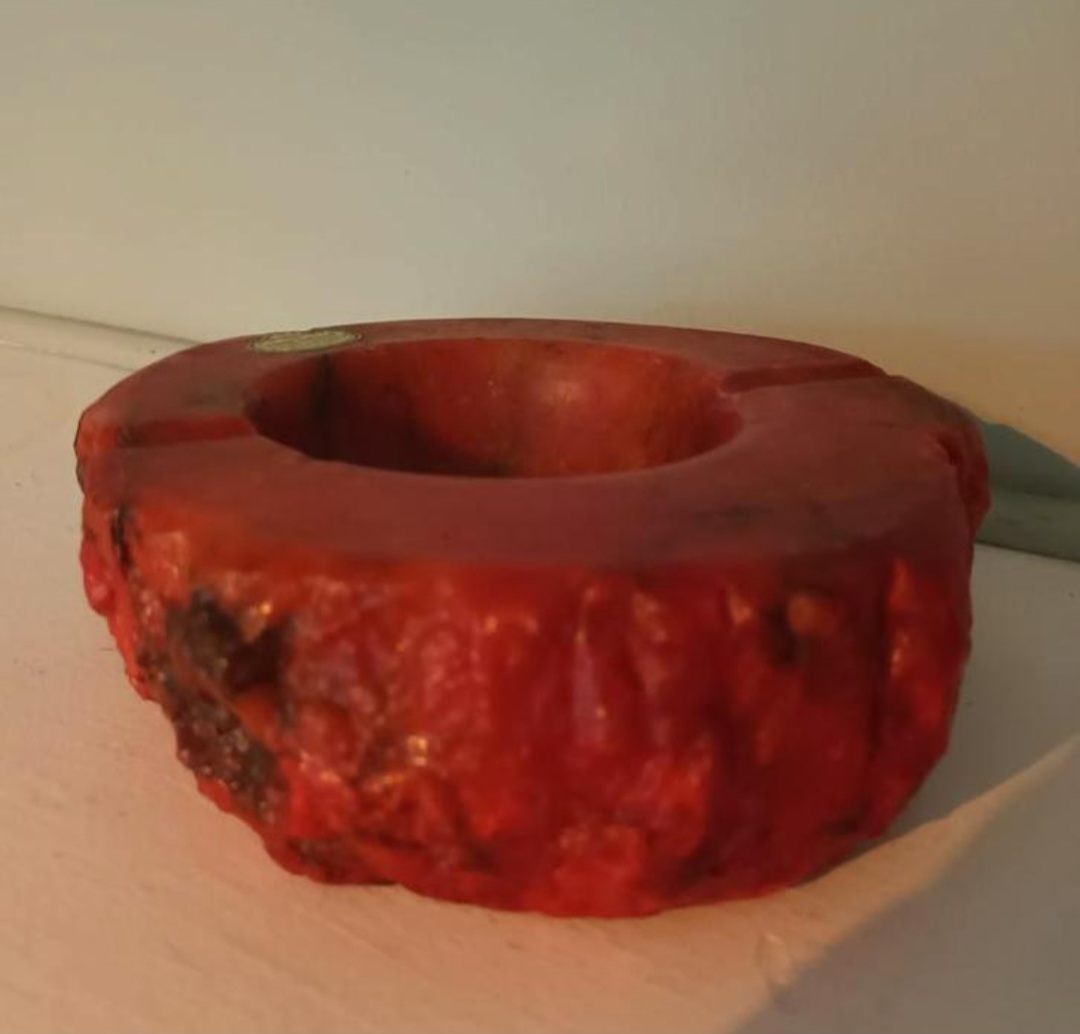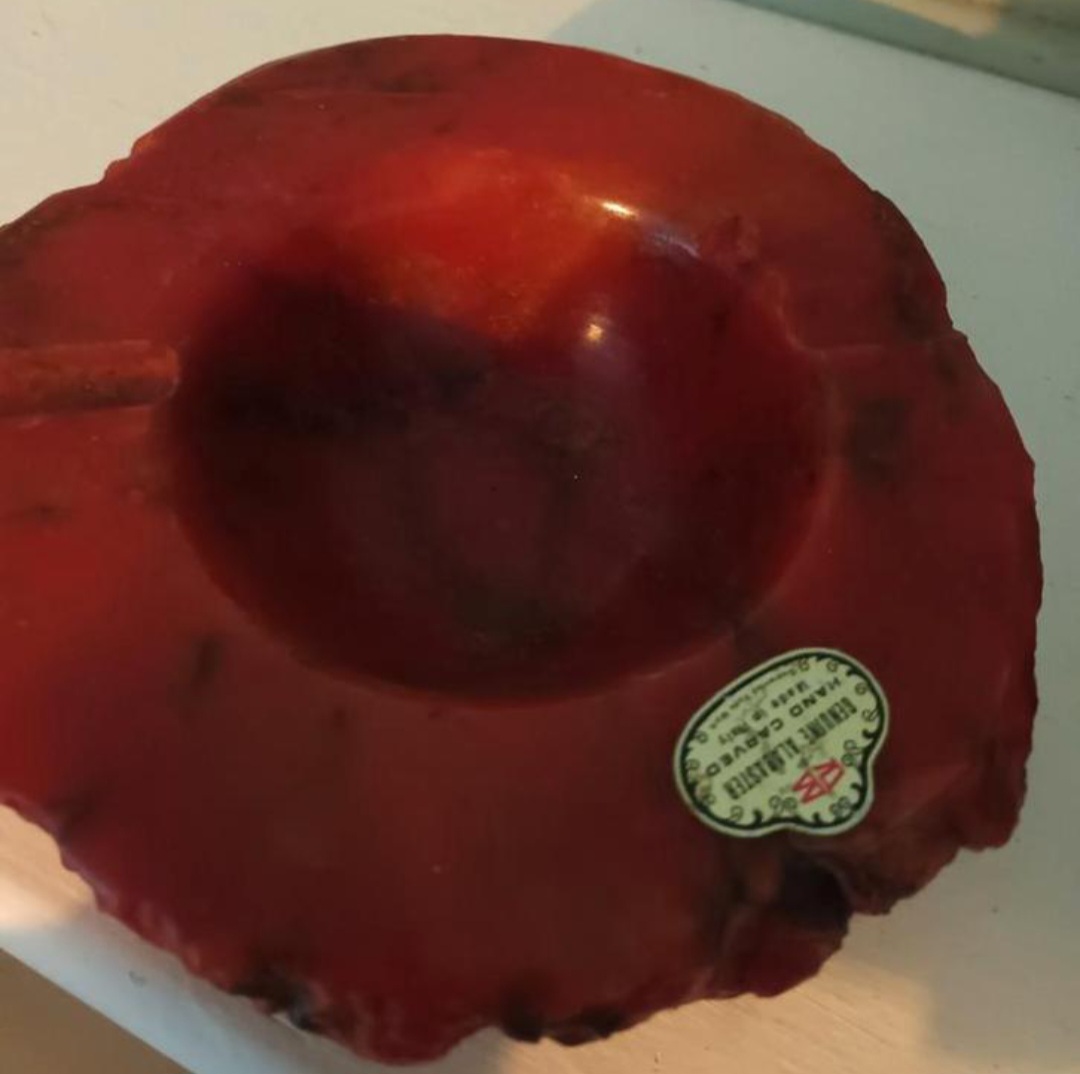 Dit object is een vintage rode albasten asbak, met de hand gesneden in Italië. Deze asbakken werden voornamelijk geproduceerd in de jaren 1960 en 1970.